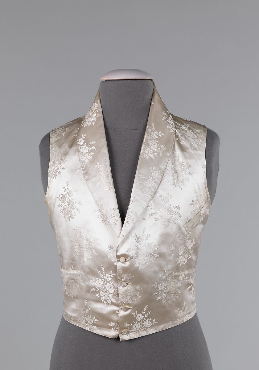 Waistcoats and vests of the 18th and 19th centuries served as a layer protection and ornamentation during a period in fashion when the coat was intended to be left open in the front. The color was often chosen to complement the suit and covered in imaginative embroideries, heavily woven patterns or shiny satins made to draw the eye. The style of the neck, the length and the hem treatment fluctuated as the tastes changed from over-sized coats of the early 18th century to narrow tightly fitted coats of the late 18th century and onward.