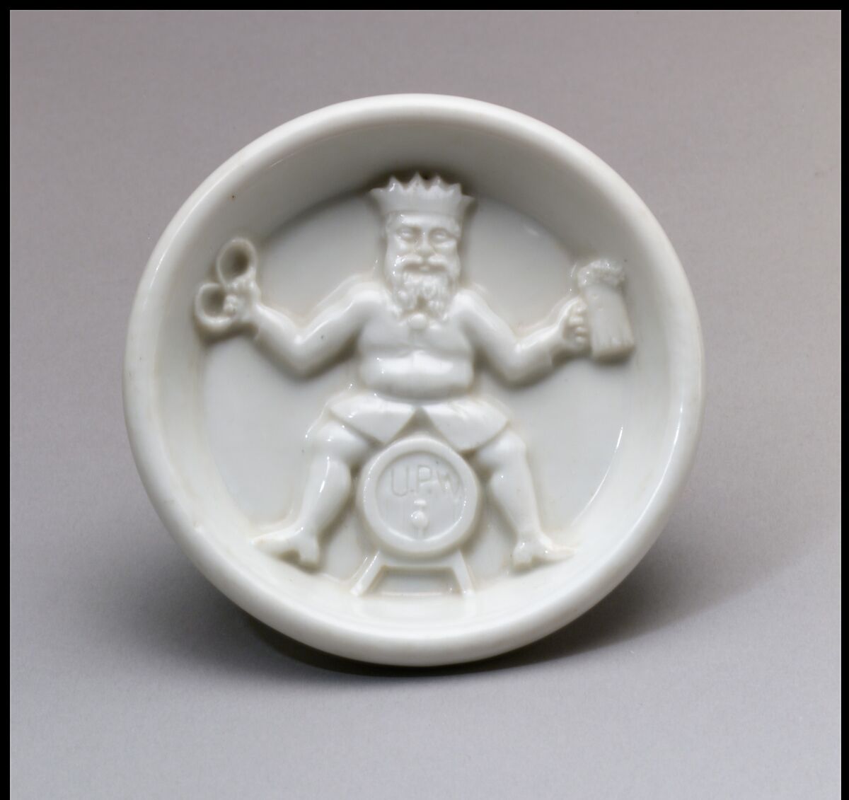This shallow dish, designed by Karl H. Müller for the Union Porcelain Works, depicts King Gambrinus, the so-called patron saint of beer, straddling a keg with a stein in one hand and a pretzel in the other. King Gambrinus also appeared on several Union Porcelain Works designs. A pitcher in the Metropolitan Museum of Art’s collection (68.103.2) depicts the mythical King offering Brother Jonathan, a predecessor of Uncle Sam, a foaming glass of beer. Like the pitcher, this dish is an excellent example of the kind of eclectic and humorous porcelain for which the New York manufacturer was known.