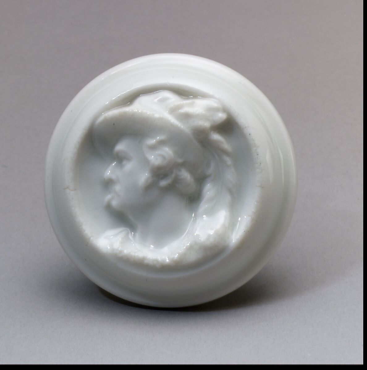 This porcelain doorknob pictures the popular nineteenth-century theater actor Edwin Forrest in costume as William Tell, the Swiss folk hero and master marksmen best known for shooting an apple off his son’s head with a crossbow. The iconography for the doorknob is similar to a porcelain bust made by the company and published in Popular Science Monthly in 1892. The Metropolitan Museum of Art’s collection also includes a larger octagonal portrait plaque of Edwin Forrest in formal street attire. The repetition of this subject is a testament to Edwin Forrest’s popularity and to Ott and Brewer’s efforts to tap into the cultural zeitgeist.