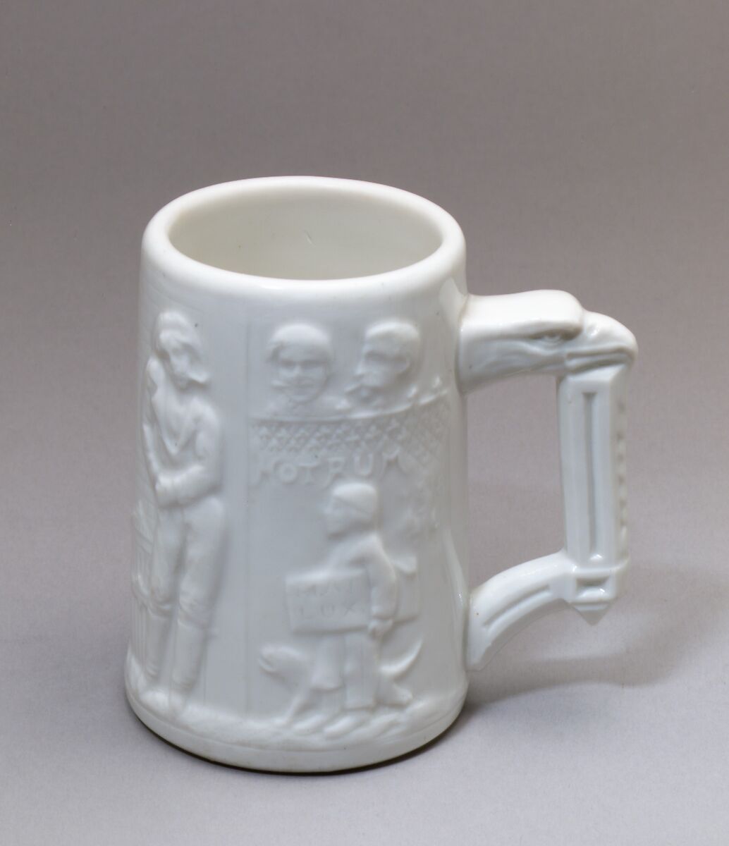 Late nineteenth-century American ceramics demonstrate a playful preoccupation with alcohol. The Union Porcelain Works alone produced several renditions of Bacchus, the Roman god of wine and revelry, and King Gambrinus, the mythical inventor of beer. While images of these mythical figures celebrate drink, this mug illustrates the dangers of over imbibing. On one register, a young newspaper boy and dog stand beneath a sign advertising "HOT RUM." On the next, a policeman with a stick grabs the collar of a disheveled young man. More playful than moralizing, this mug exemplifies the Union Porcelain Work’s humorous approach to domestic porcelain in the last quarter of the nineteenth-century.