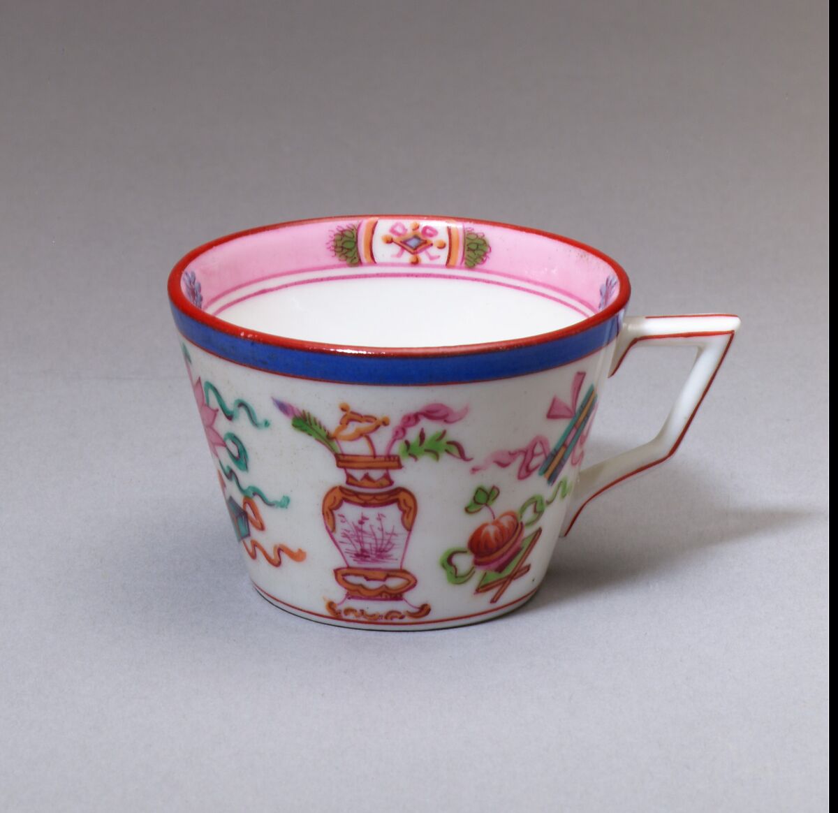 This teacup is an unusually delicate example of the decorated porcelain made by the Union Porcelain Works, a New York firm better known for heavier molded ware and sumptuous show pieces. Decorated in polychrome with Chinese motifs—vases, flowers, and scrolls—the teacup seems to emulate Chinese export porcelains which were highly valued in the late nineteenth century United States as emblems of the colonial era. Presumably it was part of a larger tea service.