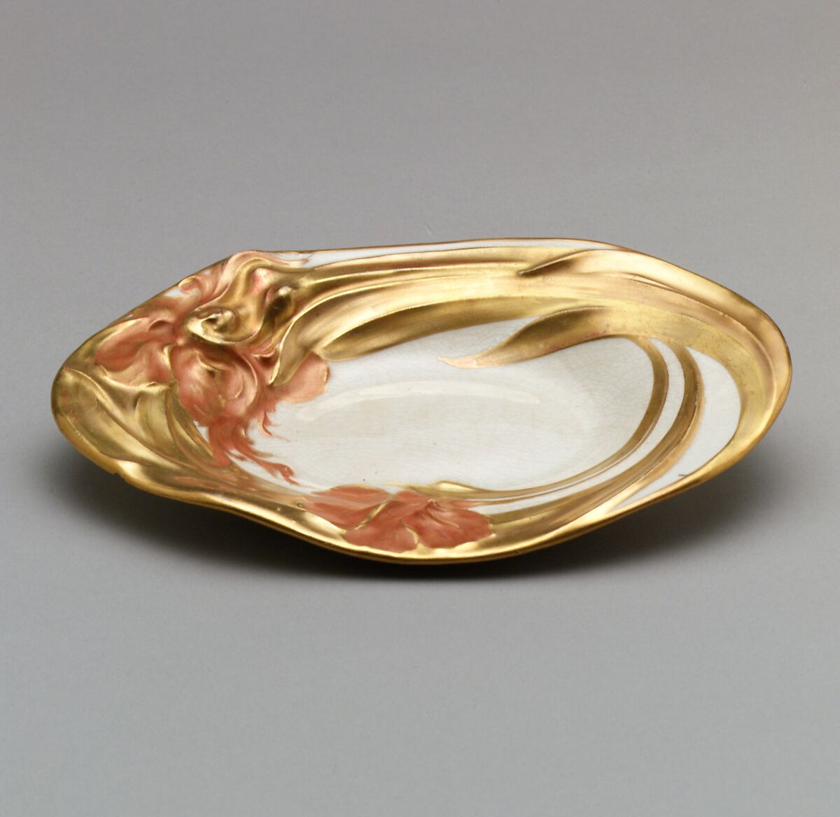 Gilded relief decoration of a stylized female figure—whose hair flows into iris petals and whose body transforms into the flower’s leaves—wraps around this oval dish. Made of molded earthenware, the dish demonstrates an attempt to translate the high style of Art Nouveau to a less expensive and more mass-produced medium. While the dish’s maker has yet to be identified, it is an excellent example of the dissemination of the Art Nouveau style in the late nineteenth and early twentieth centuries.