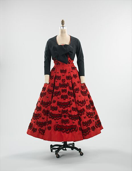 Christian Dior made masterful use of surface embellishments for his evening dresses of the early 1950s. In this example from 1952, Dior's characteristic attention to detail shows in the refined placement and graduation of the embroidery and appliqué elements. The pairing of black and red shows a Spanish influence, with the placement of the trimmings referencing the tiers of a flamenco skirt.