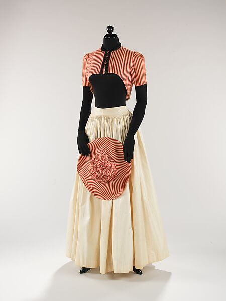 One of the last collections Schiaparelli designed before forced out of Paris by World War II, the summer 1940 collection accentuated the traits of femininity and youth. This design from that collection encapsulates both with a dose of playfulness. The short bolero jacket hits the torso at a flattering place, subtly emphasizing the bust of the wearer. The skirt, whose lightweight fabrication and tight pleating references eighteenth and nineteenth-century petticoats, is effortlessly perfect for a summer holiday. The choice of red and white striped cotton for the bolero and hat is reminiscent of striped beach cabanas. Millicent Rogers, the original owner of this ensemble and a world traveler, could have worn this while summering at one of her many homes, perhaps her Jamaican estate "Wharf House" or one of the two Rogers family homes on Long Island.