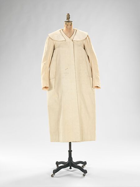 This full-sewn muslin is associated with Charles James' Coty-Award winning coat design. The holdings of the collection include a day (2009.300.3572) and an evening version (2009.300.582).