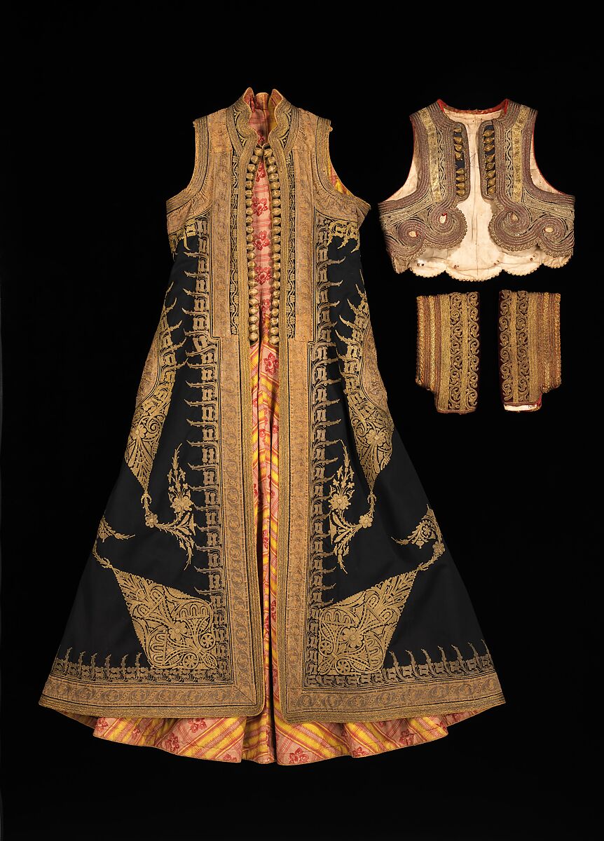 A rich variety of decoration contributes to the opulence of this ensemble. Couched embroidery, metal ornamentation and a range of textiles from velvet to printed cotton lend it an opulent air. It is particularly notable to have such a complete ensemble in such good condition.