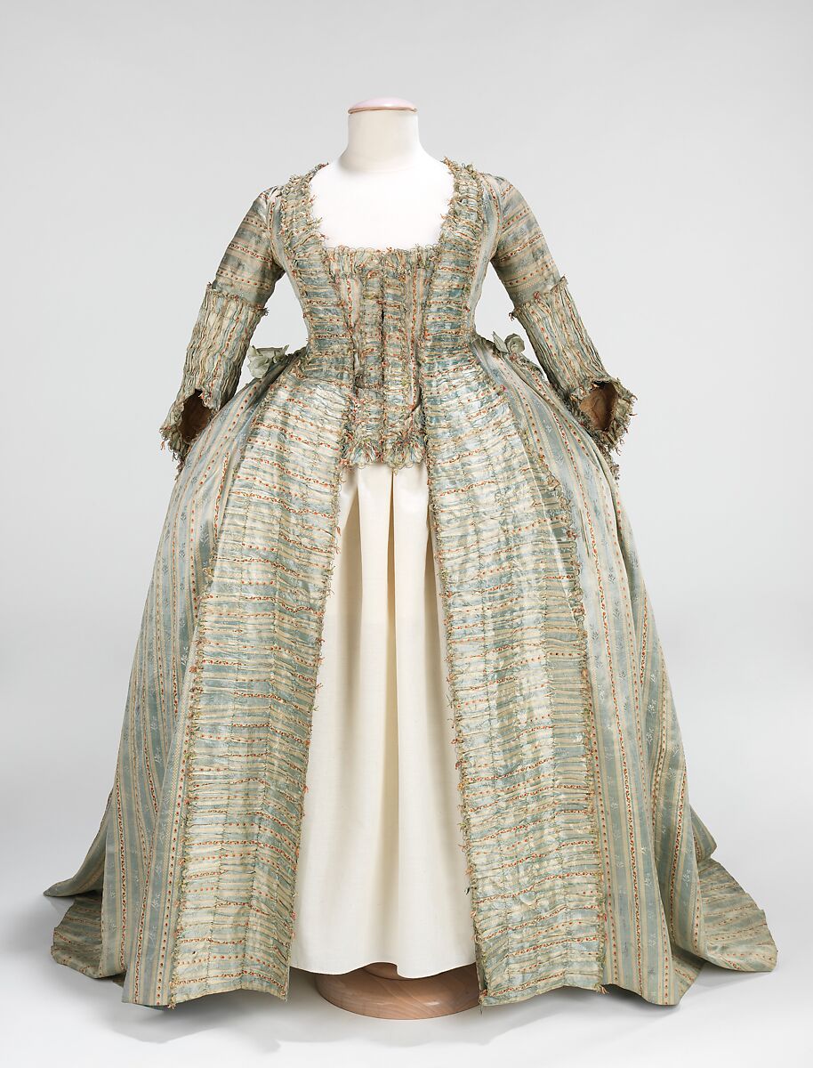 The striped textile here is indicative of the change in aesthetics around 1765 to a more neoclassical taste, less florid than the silks of the decades prior to them.