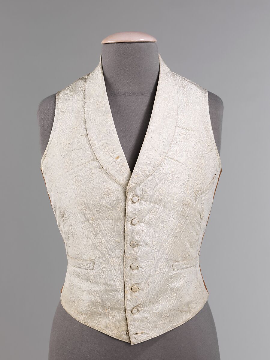 Waistcoats and vests of the 18th and 19th centuries served as a layer protection and ornamentation during a period in fashion when the coat was intended to be left open in the front. The color was often chosen to complement the suit and covered in imaginative embroideries, heavily woven patterns or shiny satins made to draw the eye. The style of the neck, the length and the hem treatment fluctuated as the tastes changed from over-sized coats of the early 18th century to narrow tightly fitted coats of the late 18th century and onward.