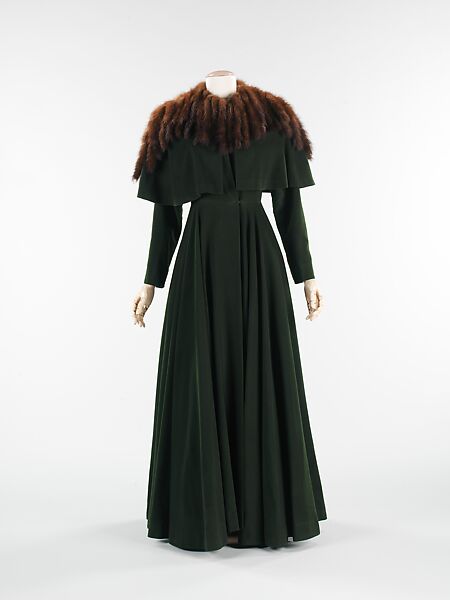 This coat exhibits Hawes' playful interpretation of trends, one of which was using animal tails as embellishment. The ensemble also has a military inspired detailing with the use of dark green broadcloth and an integral shoulder cape. The hot pink crepe bodice lining is typical of Hawes designs in that she favored incorporating contrasting colors and fabrics in unusual places for an added effect when a garment was either removed or when a normally hidden area was revealed. A photograph in a newspaper clipping located in a Hawes publicity scrapbook shows the designer addressing two society ladies at a luncheon. She is wearing her own hat, made of three animal paws in an intentional joust at contemporary hat trends of the period.
