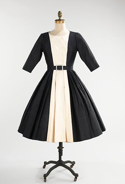 This shirtwaist cocktail dress is very appropriate for the nineteen-fifties. Simply elegant, the combination of white and black is very reminiscent of a man's tuxedo.