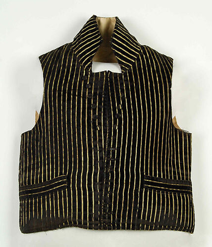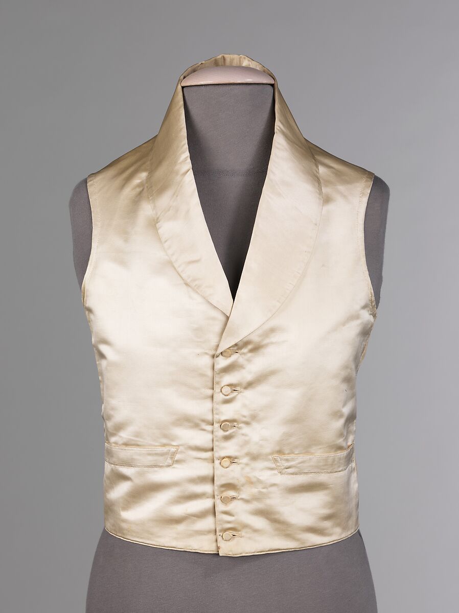 Waistcoats and vests of the 18th and 19th centuries served as a layer protection and ornamentation during a period in fashion when the coat was intended to be left open in the front. The color was often chosen to complement the suit and covered in imaginative embroideries, heavily woven patterns or shiny satins made to draw the eye. The style of the neck, the length and the hem treatment fluctuated as the tastes changed from over-sized coats of the early 18th century to narrow tightly fitted coats of the late 18th century and onward.