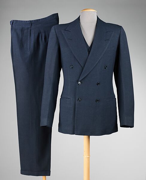 The well-dressed man of the 1930s was particularly concerned with impeccable cut and fit, which could only be achieved through custom tailoring and labor-intensive workmanship. This three-piece business suit by the highly regarded French tailor F. Cruwys shows that attention to detail, especially in the diamond-shaped piecing at the center back and the four-inch diagonal back darts.