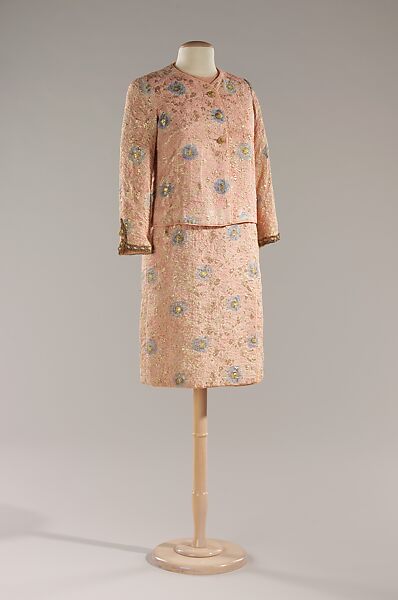 Gabrielle Chanel is the designer most responsible for establishing the modern way of dressing that encompasses comfort, function and simplicity. Chanel championed ensembles comprised of soft knit fabrics early in her career and remained committed to the practicality of matched pieces when she reopened her house in 1954. Instead of humble knits, however, in the 1950s and 1960s she sought out complex textiles made of textured weaves which sometimes gleamed with metallic threads, like this example. Chanel's eye for practicality also can be seen in the overall design of this suit. Together the garments appear to be a skirt and jacket, but the skirt is actually a dress. This design eliminated the need for a blouse, a practice Chanel often employed to minimize bulk and maximize comfort.