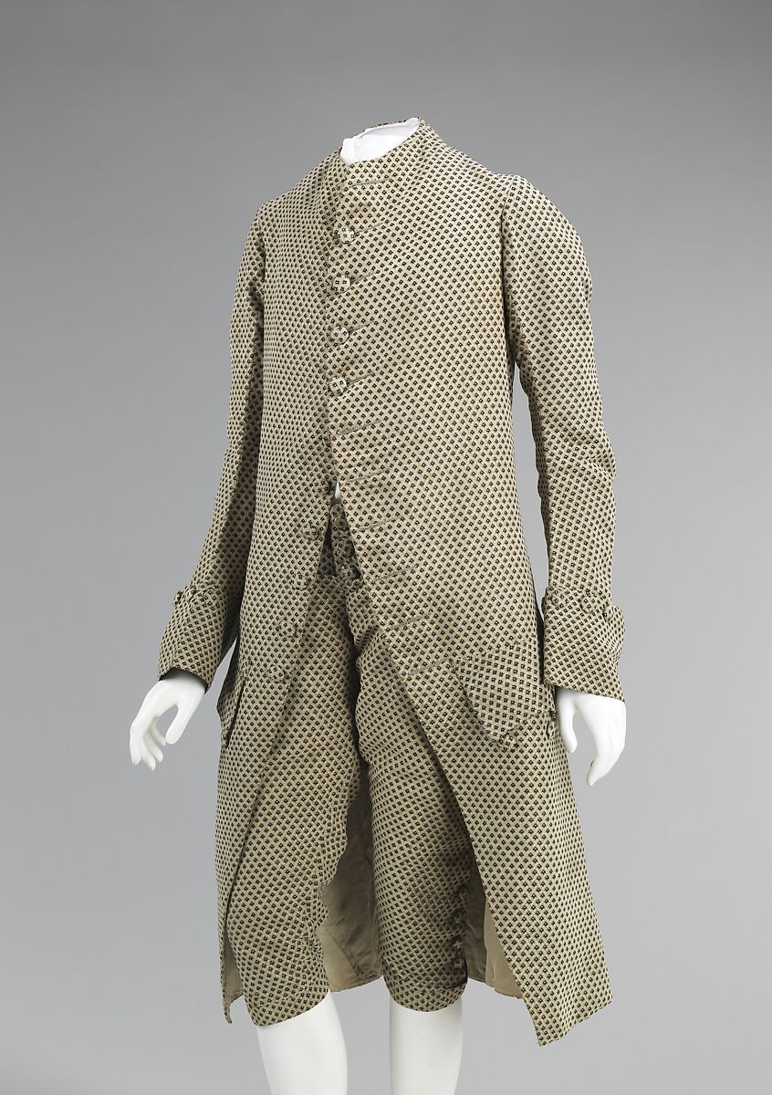Mid-18th century men's suits were slimmer than the decades prior to them with a curved front opening, narrower sleeves and cuffs, and fitted breeches with a fall front closure. This suit is a fine example of a gentleman's day suit of the period in silhouette and textile.