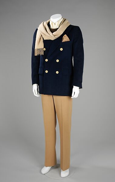 Bill Blass began his New York fashion career in 1946 working for Maurice Rentner where he gained notoriety for his elegant womenswear. In 1970 Blass purchased the company and renamed it Bill Blass Limited which he expanded to include numerous licenses, ranging from perfume and luggage to car models. Blass's legacy is that of impeccable and wearable sportswear for men and women, commonly utilizing camel hair and cashmere as seen here. This ensemble characterizes the American style for which Blass is remembered. The imitation bone buttons provide a twist on the classic blazer while picking up the color of the pants.