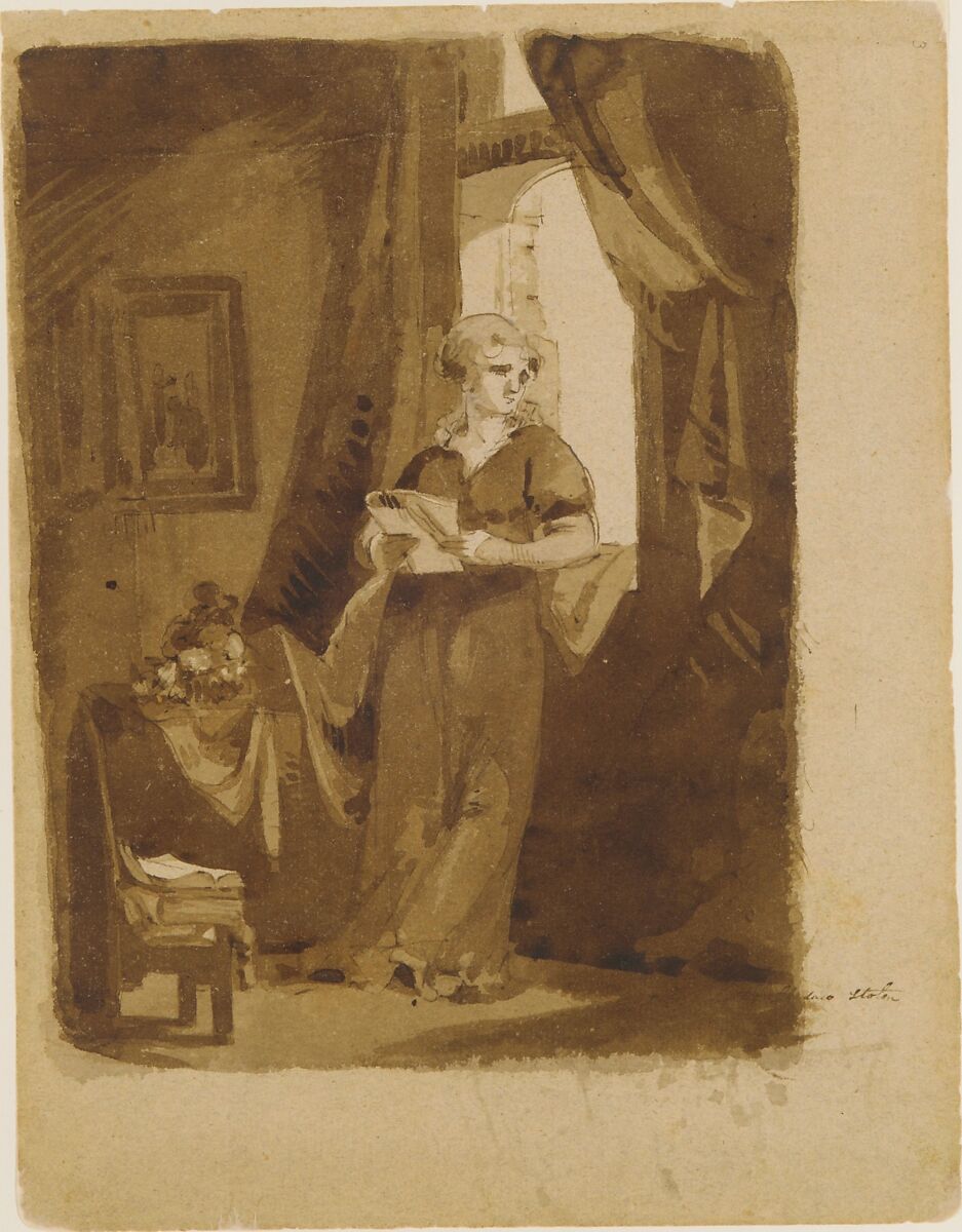 Sully used his sketchbook as a site of inspiration and study, a place where he might jot down a few figures or work out a composition. The book contains drawings after works by David, possibly Michelangelo, Reynolds, Rembrandt, Van Dyck, and other European masters, for the most part taken from prints. Sully was not slavish in using his sources; he took incentive from other artists and obviously felt free to rearrange compositional elements. For example, this drawing of a woman standing at a window is a variation on Rembrandt's 1647 etching of Jan Six. Rembrandt's setting is preserved almost completely, but the Dutch statesman absorbed in reading a journal has been replaced with the neoclassical figure of a woman who, instead of reading the journal in her hands, stares pensively out the window.