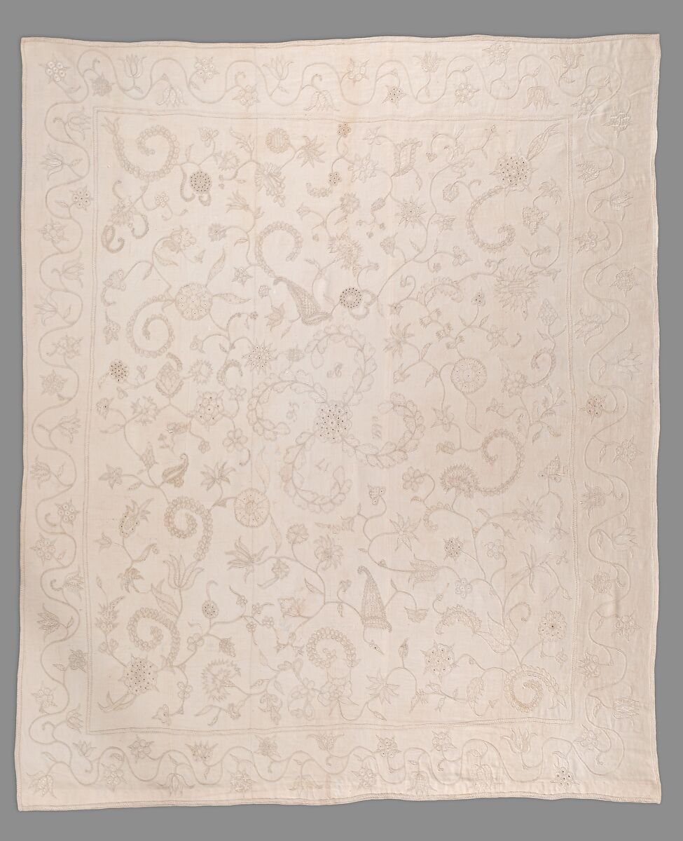 This coverlet is embroidered in patterns of flowers and scrolls through two layers of linen. The overall pattern shows central floral vines and sprigs, with a meandering floral vine border. The embroidery contains long stitches and cross stitches as well as knots and eyelet stitches binding off the edges of openings through the two layers. The upper layer of fine linen has been cut away around the embroidered motifs, leaving the exposed under layer of coarser linen. The finer upper layer is still present within the embroidered areas. The coverlet is made up of three narrow panels of linen that have been seamed together.