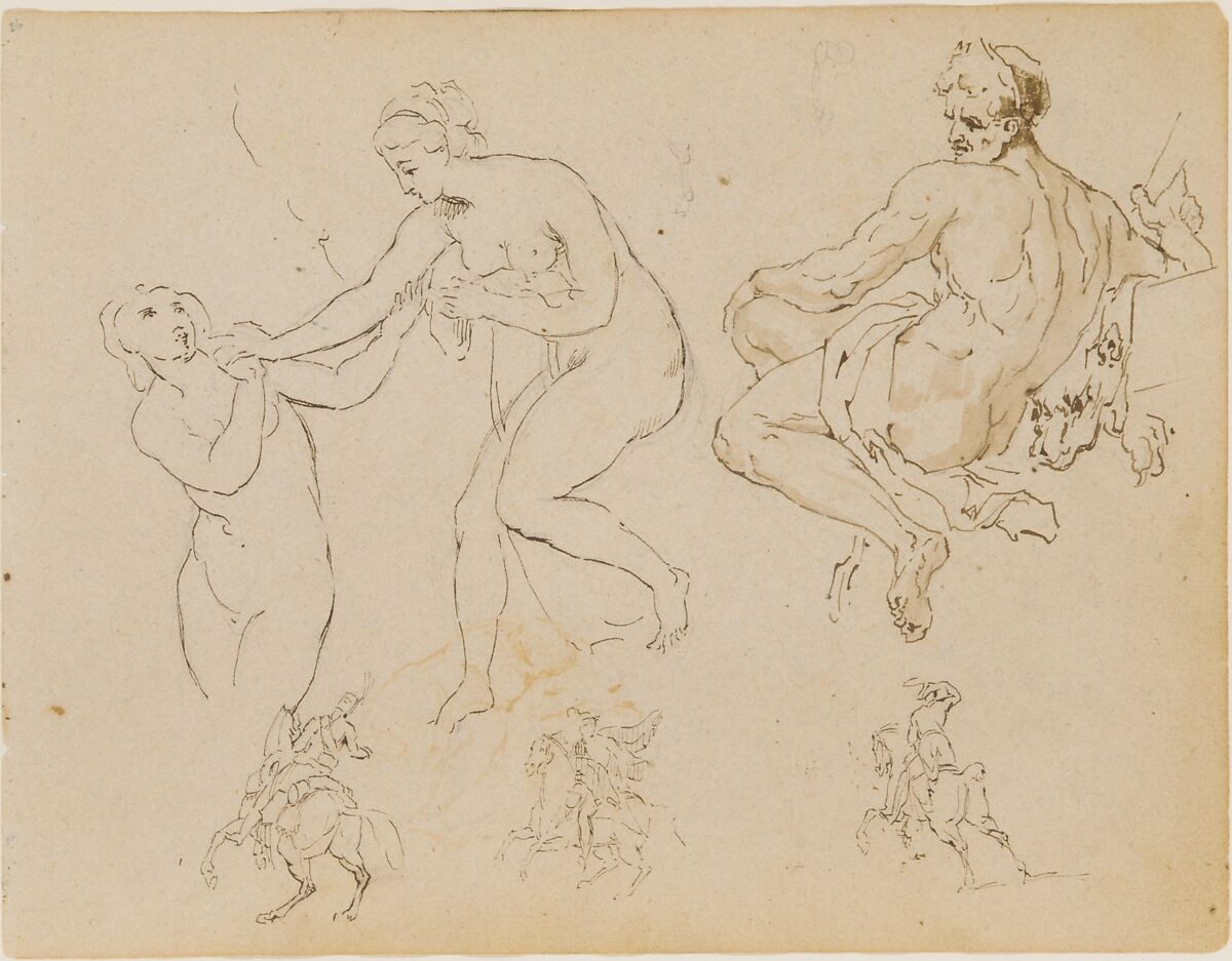- Title: Two Female Nudes; Seated Male Nude (after Michelangelo?); Three Equestrian Figures (from Sketchbook)