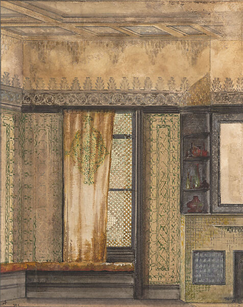 This drawing for an unknown client incorporates many of the ideals of the American Aesthetic movement, which was at the height of its popularity from the mid-1870s to the mid-1880s: the use of flat patterns, exotic references, and shimmering surfaces. The decoration does not refer to a single culture but instead creates a dazzling fantasy of exotic opulence in keeping with the late-nineteenth-century worldview. The geometric leaded-glass window recalls those in the Veterans' Room at the Seventh Regiment Armory in New York, which Tiffany and Associated Artists decorated in 1880.