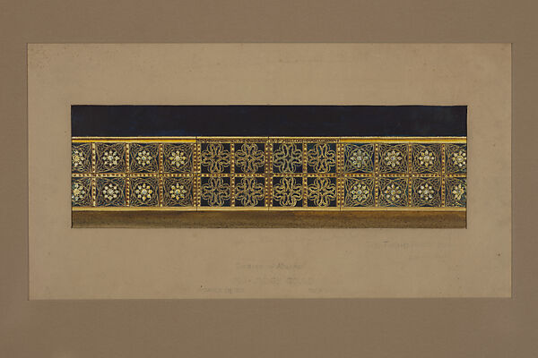 The altar rail based on this design exists, slightly altered, in St. Paul’s Church in Troy, New York, where it was installed after major renovations in the 1890s. The rail was commissioned by Sarah McCoun Vail Gould (1821–after 1880), wife of George V. Gould (1807–1868), Troy mayor and Supreme Court judge. The inscription on the reverse dedicates it “To the memory of Sarah Vail Voorhees” (1846–1872), the couple’s daughter, who presumably died in childbirth. The symmetrical filigree floral design is influenced by both Islamic geometric tiles and window screens, which were frequently employed in architectural settings both domestic and public.