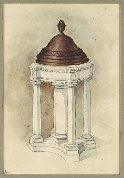 - Medium: Watercolor, pen and ink, and graphite on off-white wove paper or artist board in original warm grey window mat