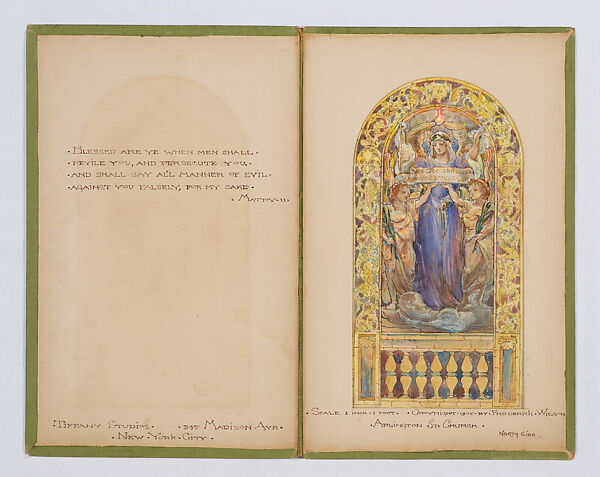 This highly finished presentation drawing is for one of six figural windows depicting the beatitudes in the balcony of the Arlington Street Church in Boston. Wilson originally created ten window designs representing the blessings by Christ in the Sermon on the Mount (Matthew 5:1–12), six of which were executed in glass. It is likely that this drawing was formally presented to the Arlington Street Church—it is mounted in a green cloth-covered portfolio with the Tiffany Studios’s monogram on the cover. Several years earlier, Wilson designed a different beatitude window for Calvary Church in Summit, New Jersey. A critic from the New York Times praised Wilson’s success in translating “purely abstract definitions of principles…into the language of the illustrator.”