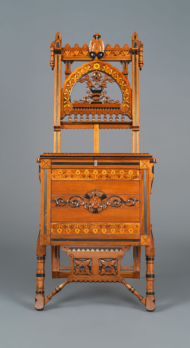 - Medium: Walnut, ebonized wood, marquetry of lighter woods, brass