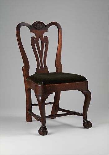 The attribution to Thomas Howard Jr. is based on the similarity of this chair's feather-and-shell carved splat and its patterned inlay to that on others attributed to this cabinetmaker.