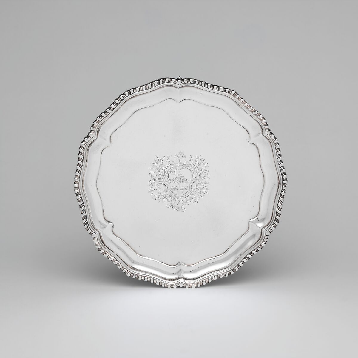 During the 1760s and 1770s gadrooned serpentine rims replaced the scroll-and- shell borders characteristic of mid-eighteenth-century salvers (see cat. no. 39). Although unmarked, the present salver closely resembles examples made by several New York silversmiths, including Myer Myers, John Heath (1721–1806), Ephraim Brasher, and John Burt Lyng (active ca. 1761–1785). Its spirited and loosely rendered engraving particularly recalls objects marked by Myers, for instance a matching pair of salvers engraved with the Philipse family arms or a salver commissioned about 1770 by Maria Van Beverhoudt. David Barquist notes that Myers began to use this engraver around 1765 for his most important commissions and that the same craftsman appears to have engraved silver for several of Myers’s competitors. Probably an independent artist available for hire, the engraver remains unidentified.