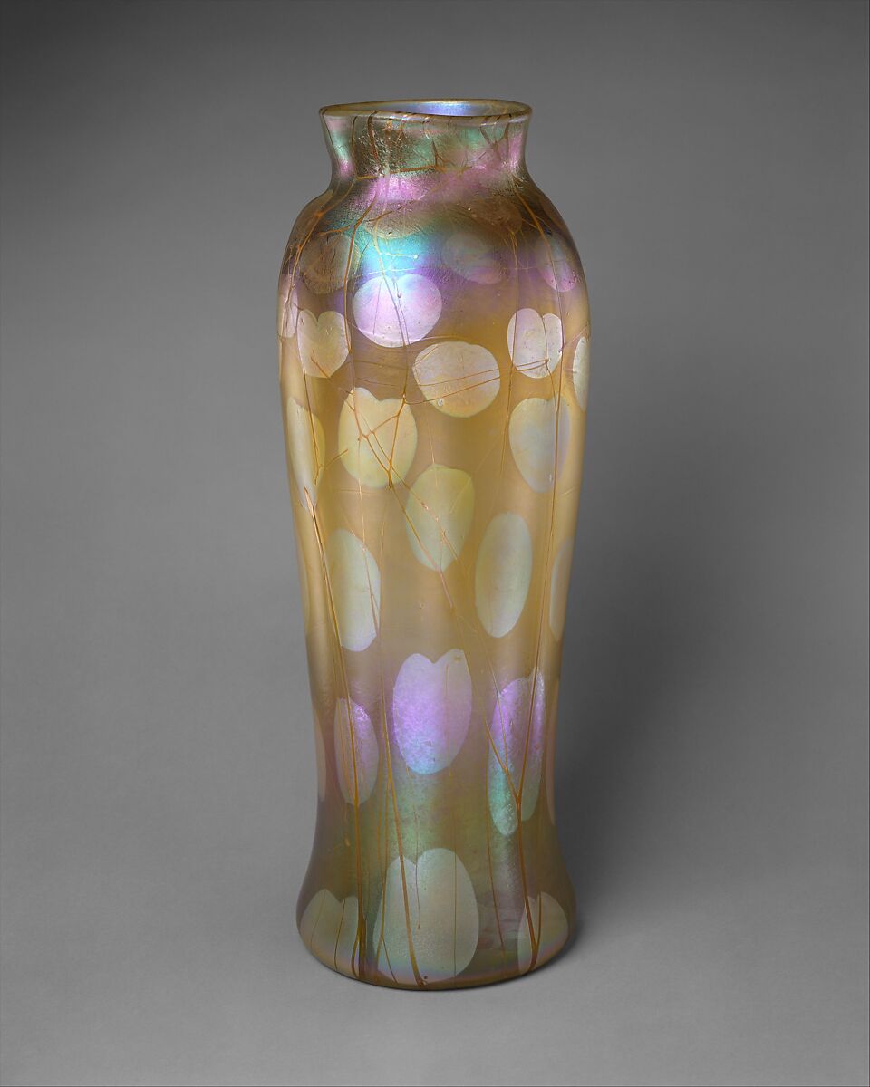 This large-scale, baluster-shaped, golden iridescent vase with a lily-pad design was displayed in Tiffany's award-winning exhibit at the Paris Exposition Universelle of 1900. His participation in this fair was a triumph, gaining him international renown and clientele. Critics raved about his art glass in particular. The size, shape, color, and texture of the vase, which was later owned by Tiffany's sister, make it a remarkable example of Tiffany's best work.