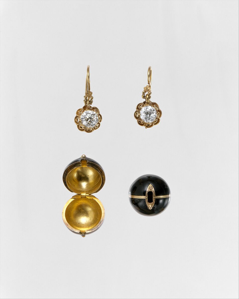 Beauty and practicality are combined in these diamond drop earrings with removable “coach covers.” Two old mine cut diamonds are set in gold floret, prong mountings and dangle from gold hooks. The spherical, hinged “coach covers,” also made of gold, are coated with black enamel and snap closed to conceal and protect the valuable diamonds while the wearer is traveling. Snap-on earring covers were an American innovation of the 1870s and 80s, and were generally made with black enamel or inconspicuous gold ornamentation.