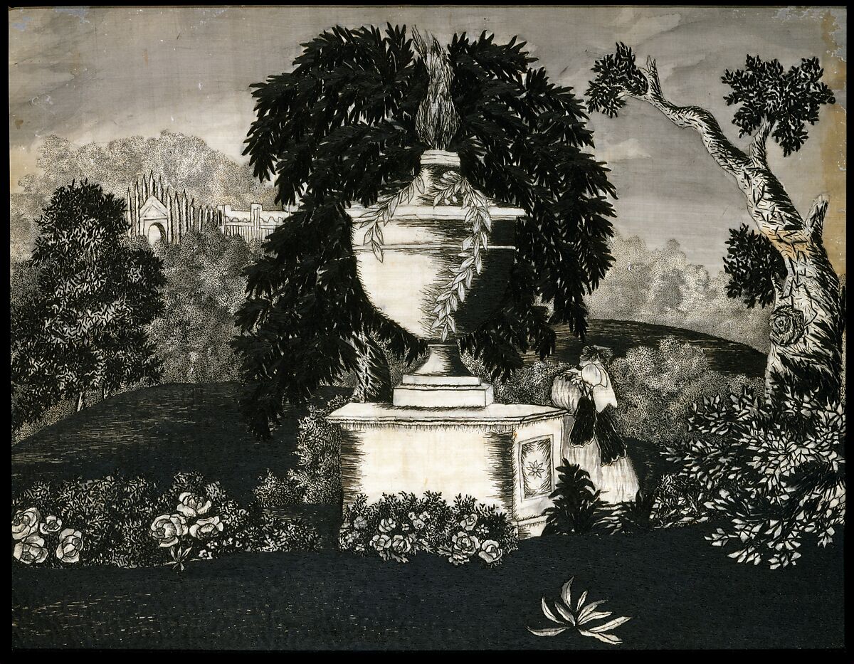 A large flaming urn resting on a plinth is at the center of the composition. Beside it stands a weeping young woman, her face cover by a handkerchief. She stands within a richly rendered lush landscape populated with traditional symbols of mourning: the branches of a weeping willow embrace the urn; a blasted dead tree reaches into the sky; and in the distant background are the ruins of a church. Careful examination reveals subtle areas of black ink or watercolor wash that heighten the depth of the black against the white silk ground.