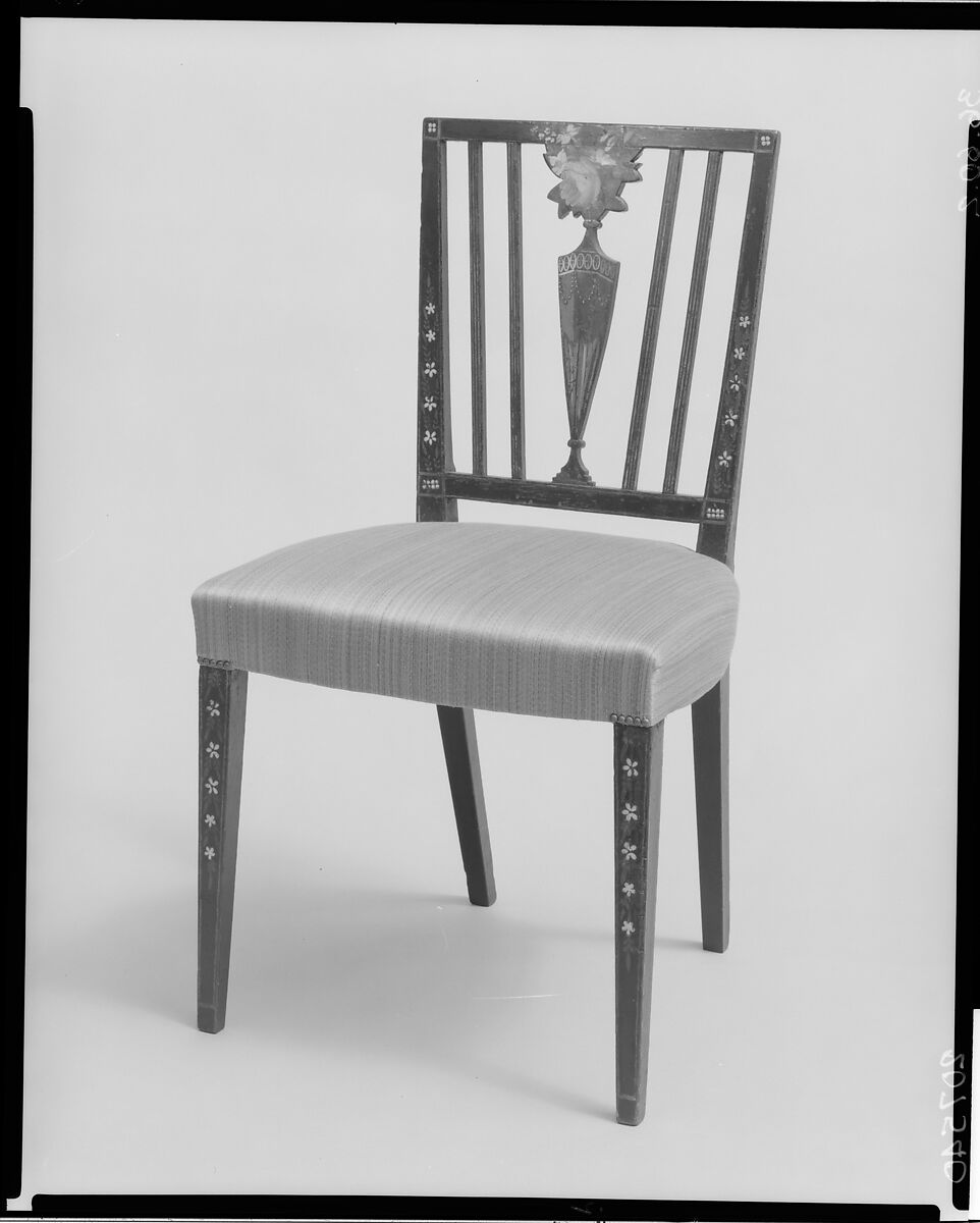 The design of this chair and related pieces is derived from a plate in Thomas Sheraton's "The Cabinet-Maker and Upholsterer's Drawing-Book" (London, 1792). The attribution to New York is based on its history, design, and the presence of curved medial braces of cherry beneath the seat. The chair originally belonged to John Carter, a stone merchant, whose home was at Delancey and Broome Streets in New York.
