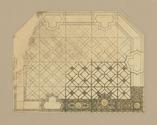 This skylight was intended for the ceiling of a library within a grand home. A bust of Homer anchors one part of the border with an inscription indicating that the space to the left would depict Dante. While these literary references enhance the function of the room, the preponderance of undecorated glass in the central field allowed light needed for studying and working. Inscribed in pencil below this design is the notation “design for diffusing light,” indicating the primary function of this skylight. Designers at Tiffany Studios intended to fill the spaces between the leaded mullions with opalescent glass, which worked to diffuse direct sunlight from above. Sunlight, filtered through windows, was considered less tiring for the eyes while working and reading than the new artificial illumination.