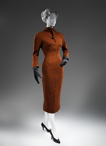 This narrow dress, designed for the Samuel Winston line, is literally molded to the figure at the bustline. The seams that cleave the cloth to the rest of the body segment it into atypical pattern pieces. The horizontal seams across the bust and at the upper thigh are connected by vertical seams. What would normally be princess seams are shifted to the side of the bust while, at the back, long darts from the shoulder yoke enhance the glovelike fit.