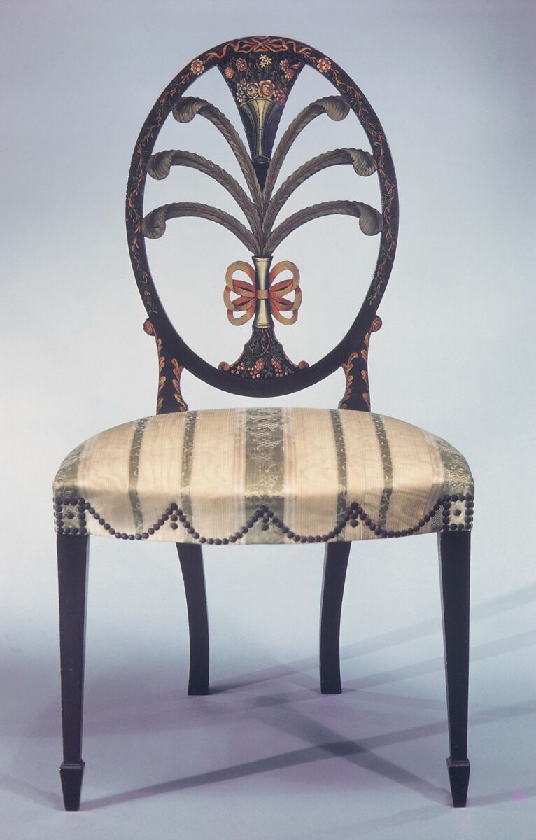 The design for this oval-back chair was based on an engraving in George Hepplewhite’s "Cabinet-Maker and Upholsterer’s Guide" (1788). Other chairs thought to be from this set of twenty-four also have an oval back but are painted white instead of blackish brown.