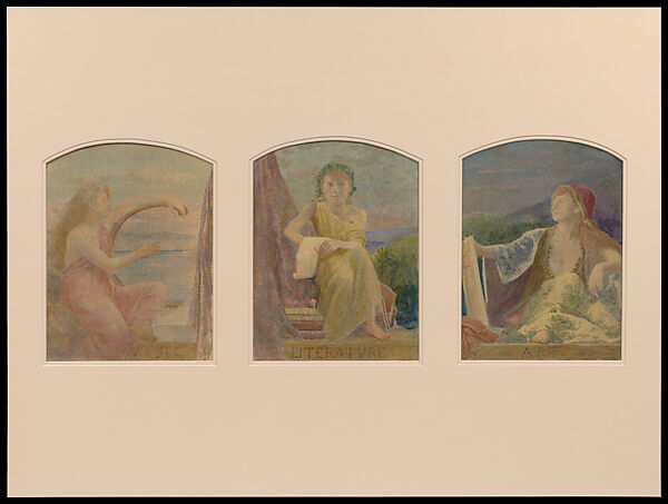 The Eaton family, owners of the large department store T. Eaton Company, commissioned this design for three leaded-glass windows, presumably for "Ardwold," their estate built between 1905 and 1911 in Toronto, Canada. By that time, Tiffany’s artistic renown extended beyond the United States. The three compositions in this design each depict a seated figure representing a branch of the humanities, and from left to right denote Music, Literature, and Art. The allegorical figures, reminiscent of the mythological muses, are placed in a pastoral painted background. The Canadian artist, Farquhar McGillivray Knowles (1860–1932), whose name appears on the bottom left corner, was commissioned to paint a mural series for "Ardwold" with similar landscapes and classically dressed figures, which suggests these windows were also intended for this interior.