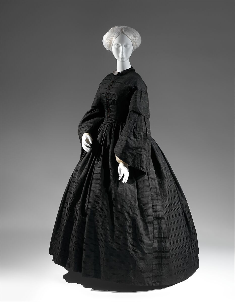 By the late Middle Ages in Europe, black had connotations of mourning, though it could also suggest worldly elegance and luxury, in part due to the costliness of black dye. Broadly worn as the color of grief during the nineteenth century, black could be perceived as both humble and sober or sophisticated and becoming. A shade of true deep black that did not quickly fade toward blue or brown was the mark of a fine-quality textile and the ideal for mourning attire. In their 1856 catalogue, Besson and Son’s Mourning Store of Philadelphia assured prospective buyers of the quality of their black goods, promising only "what is of the proper shade of black." This simple afternoon dress, appropriate for the third, or ordinary, period of mourning, is composed of a taffeta woven with narrow horizontal bands and dots in soft black.