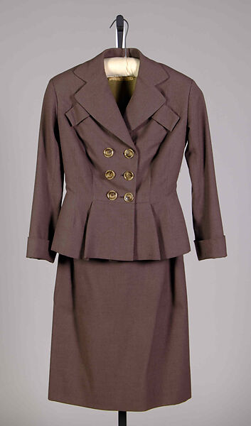 a. Jacket: Hip-length; fitted with peplum; double-breasted; notch lapel; turn back cuffs; two angled mock pockets at bust