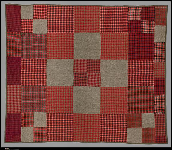 This quilt was purchased in Rochester, New York. Plaid fabrics like those seen here, originally used for clothing and blankets, were often pieced together into warm, everyday quilts like this one. The preference for plaids in Ontario is indicative of the large Scots-Irish population and of the influx in the nineteenth century of professionally trained weavers from the British Isles. Canadian woolen quilts are frequently quilted across their entire surface with overlapping arcs or fans.