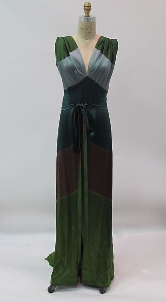 This dress, with its simple construction, is a tribute to Adrian's surprising and sophisticated use of color. Surprising because it is rare to find three different shades of green and brown in such large blocks on a one-piece evening dress and sophisticated because of their coherence. Adrian's assistant designer remembered him contemplating color combinations from across the room, then asking them to be brought closer to make sure they still "looked good." With "colors,“remembered the assistant forty-five years after Adrian's death, "he was perfect."