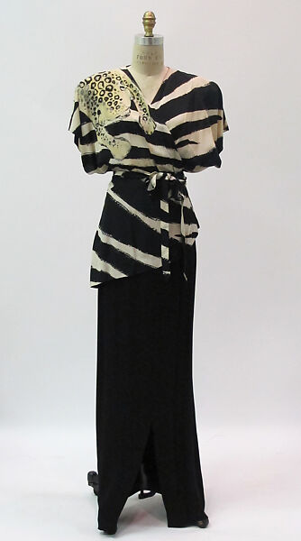 African culture was the converging ground for several of Adrian's design themes, including animals. He had become fascinated with Africa at the age of twelve, after seeing a film documentary on the subject. Keenly interested in the cultures of the Sudan and the Belgian Congo, Adrian painted scenes from his imagination before going there with his wife, Janet Gaynor, on a nonhunting safari in 1949. Created three years before he visited Africa, this dress shows a cheetah ironically slung over the shoulder of the flamboyantly striped zebra.