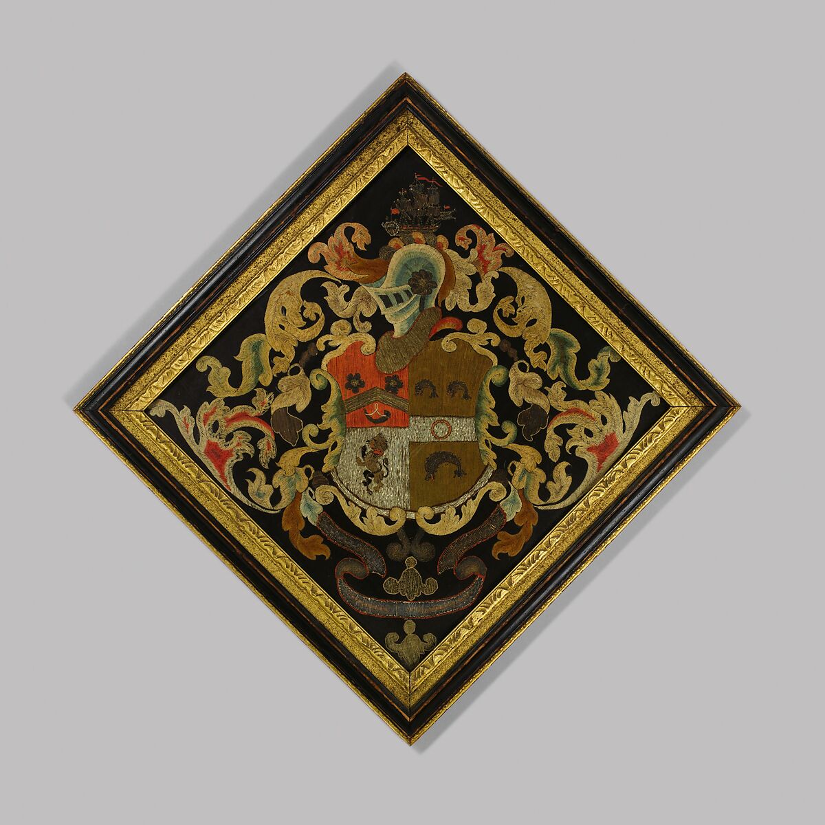Embroidered coats of arms were only produced in New England in the 18th and early 19th centuries. Those made in Boston, replete with gold and silver thread, are the most richly worked American needlework. This type of embroidery was created by only quite well-to-do girls from the Boston area, since while three months of schooling to learn how to make one cost six pounds, the embroidery threads, made with real precious metals, could cost over thirty pounds (the equivalent of about $9000 today). Their personalized design, production, and heraldic references combine to reflect not only women’s education at the time, but also the role young women played in perpetuating their family histories and social status. Combining emblems to represent her father’s Duncan lineage and her mother’s American and English descent in the Phillips and Lemmon families—Sarah Duncan’s coat of arms is a visual representation of her roots.