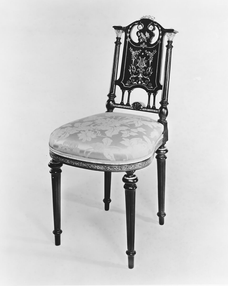 This chair and its mate are attributed to Leon Marcotte on the basis of their style and the mother-of-pearl marquetry set into veneer panels. In shape and design, particularly in the stiles and ribbon cresting, the chair follows late-eighteenth-century precedents. The brass beading, the carved fan, the small turned spindles, and the metal rings on the upper legs are nineteenth-century innovations.