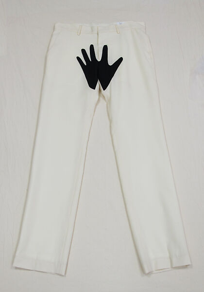 In November 2012, Yoko Ono worked in collaboration with the New York boutique Opening Ceremony to create “Fashion for Men: 1969–2012,” a line of avant-garde menswear based on sketches she had made for John Lennon as a present for their 1969 wedding. As Ono told Women’s Wear Daily, “I was inspired to create ‘Fashions for Men’ amazed at how my man was looking so great. I felt it was a pity if we could not make clothes emphasizing his very sexy bod… So, I made this whole series with love for his hot bod and gave it to him as a wedding present. You can imagine how he went wild and fell in love with me even more.” The designs in this collection, rendered in black, white, and hot pink, feature mesh panels, cutouts, and appliqued hands strategically placed over what Ono considered to be the most attractive parts of Lennon’s body. The garments were produced in a limited run: only fifty-two of each style was made.