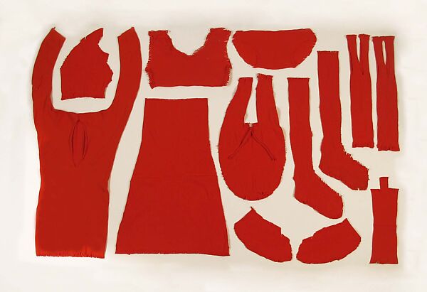 Issey Miyake introduced his APOC, or "A Piece of Cloth," apparel concept in 1997. Designed to highlight the two dimensional quality of cloth and to minimize waste, APOC garments were produced in machine made rolls of knit fabric pre-sewn or fused with finished patterns. The user cut the pattern from the roll to create a ready-made, customized garment. This complete, cut APOC ensemble in red knit includes a top, a bra, a skirt, briefs, socks, mittens, armbands, a cap, and a handbag.