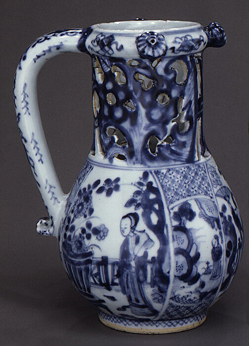 The model is derived from one originating in English pottery by 1653 and copied at the Dutch Delft factories by the early 18th century.