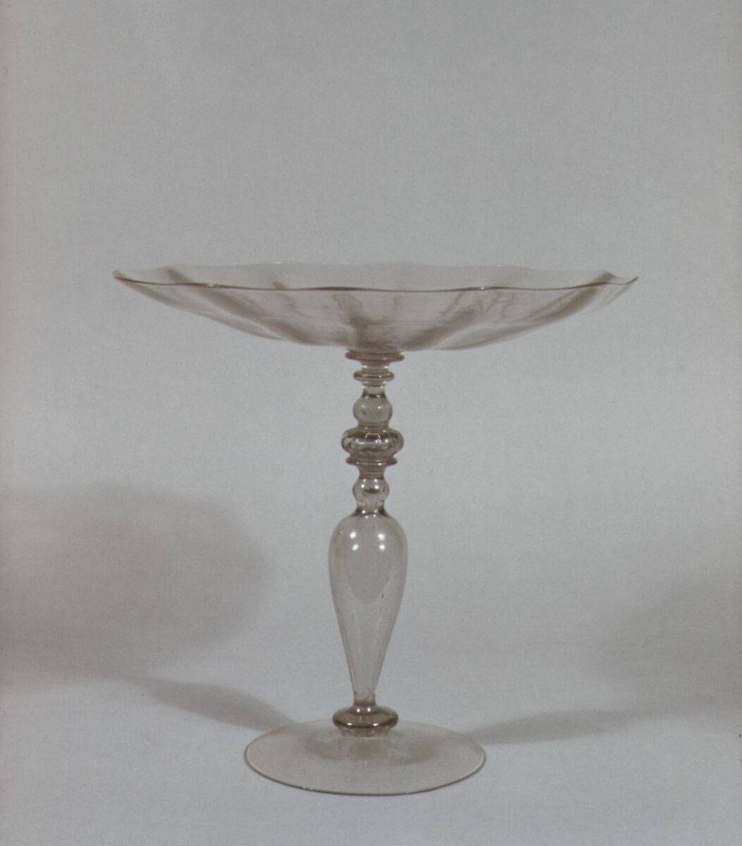 During the Renaissance, Venetian glassmakers, working on the island of Murano, were celebrated across Europe for their fine and sparkling work. Called “cristallo” emulating the clarity of rock crystal, in the hands of the most skilled glassblowers the medium could be delightfully manipulated, variously stretched paper-thin flat, or playfully twisted, or blown into molds with spectacular patterns.