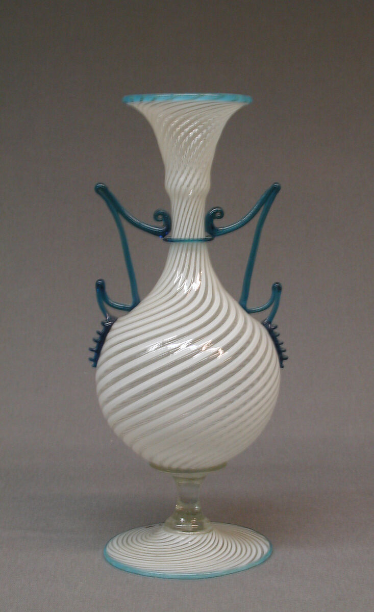 The bands of white opaque glass that swirl around this vase are an example of filigree decoration. The first records for filigree glass in Venice date to 1527. Netted versions called reticello resemble lacework. Though the bead maker Dominique Bussolin first revived the technique in 1838, it initially found little commercial success until the Risorgimento.