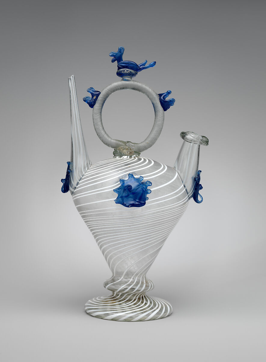 This distinctively Catalan form of communal drinking vessel evolved during the seventeenth century, although the very fine examples shown here are later. One spout is for filling and the other for drinking without having the vessel touch the mouth.